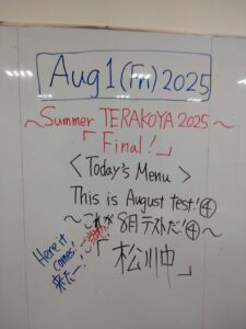 「真夏の学習の祭典」恒例の「サマーてらこや」が今年も7月28日(月)から8月1日(金)の5日間、松川町公民館「えみりや」の特別教室で華々しく開催されました!今年も私は中学3年英語の「発展コース」を担当させて頂きました。今年は例年とは異なり、水曜てらこやの女子受講生の人達が全員、私のクラスにそのまま参加!そこにサマークラスに新規参加のこちらも女子(!)の受講生の皆さんが加わり、大変、賑やかで楽しい、そして中身の濃い6日間となりました。今年も過去の8月実力テストをご当地松川中学校だけでなく近隣の中学校3年の問題も導入してガッチリ解きました。英語力のレベルは人それぞれでしたが、夏休みのひととき、2学期の成績アップにつながる有意義な時間であったと願っています。^^